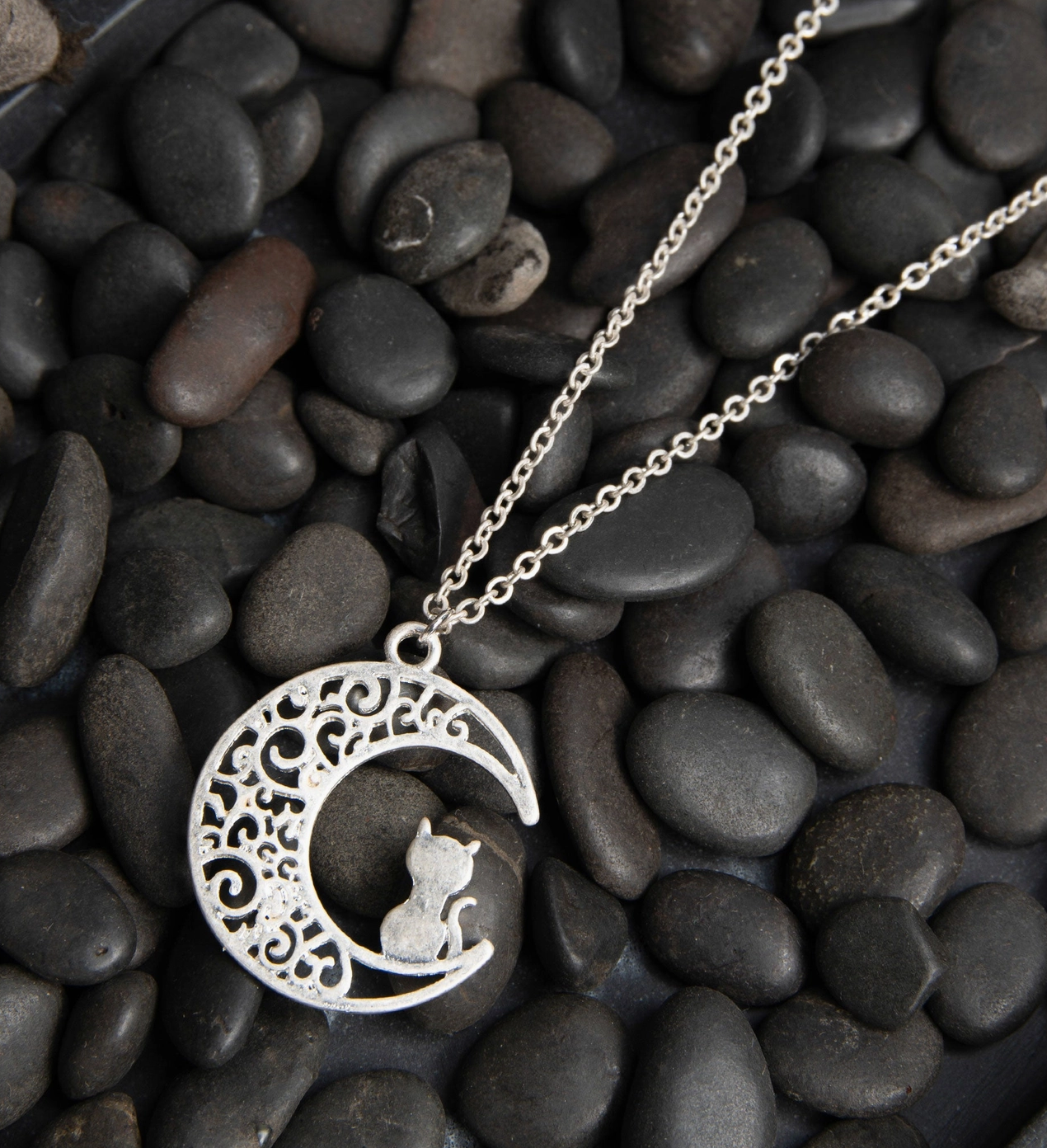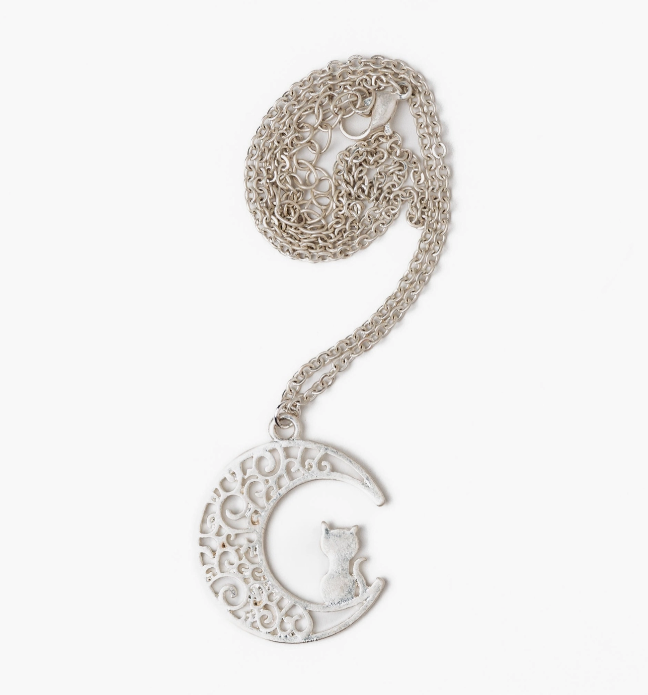 Moon & Cat Pendant Necklace. Featuring a delicate silver chain with filigree crescent moon and cat silhouette pendant, this statement necklace adds a bit of festive flair to any look.