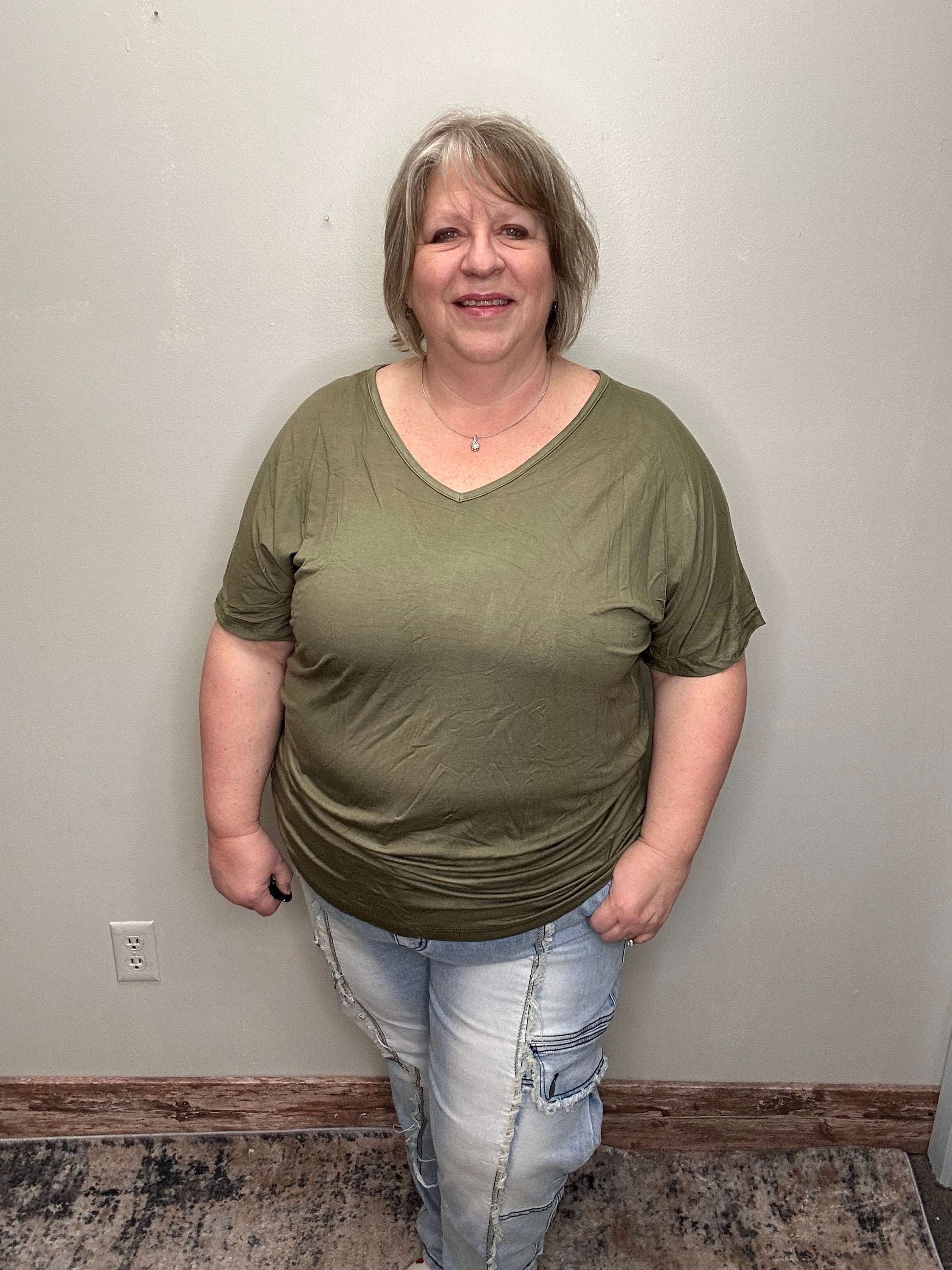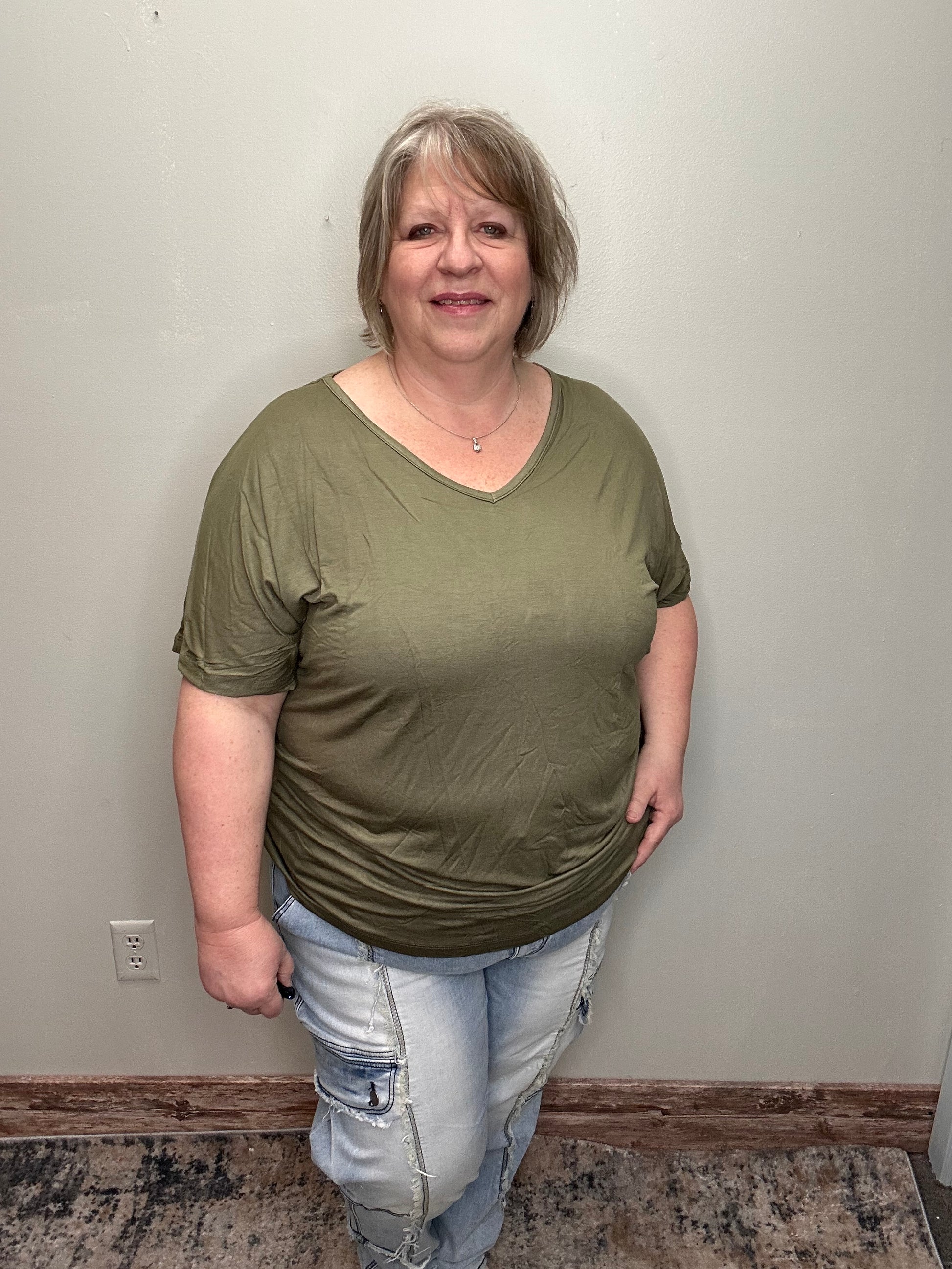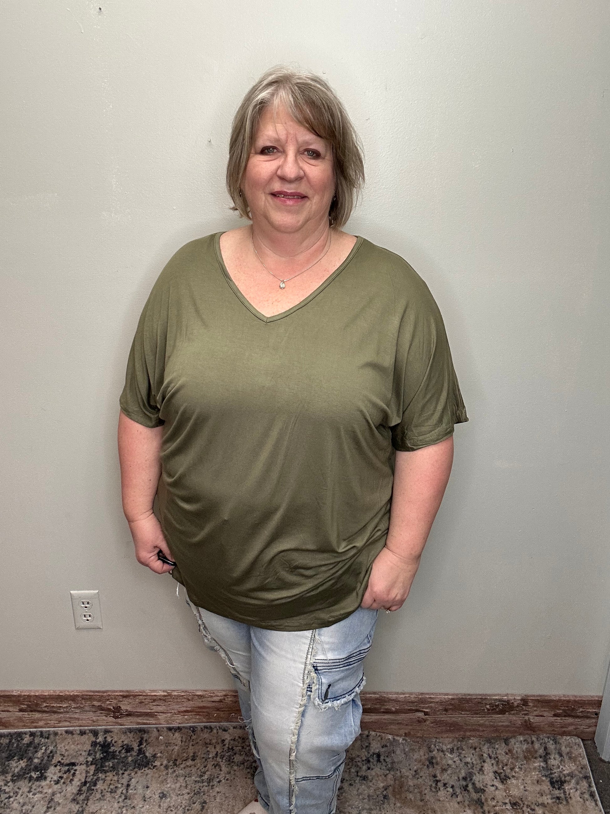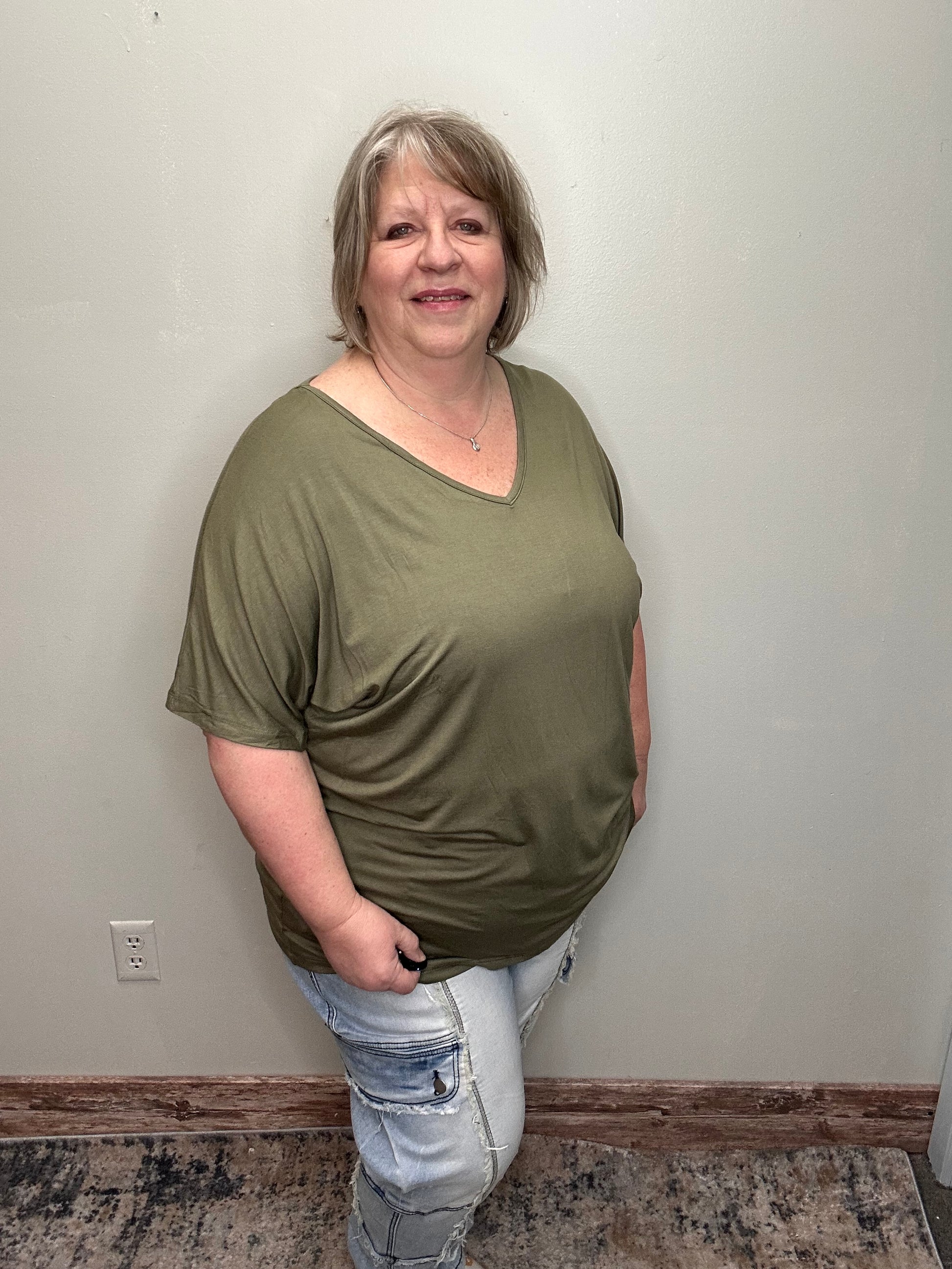 This top features a flattering V-neckline, complemented by longer short sleeves and a stylish dolman cut, providing a relaxed yet distinctly feminine fit. The blend of 95% rayon and 5% spandex ensures a flexible, soft feel, perfect for your everyday wear.