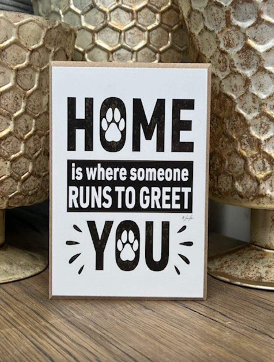 This block has a white background and in black font reads, "Home is where someone runs to greet you" with paw prints inside of the O in home and you. A great block for every home that has someone that runs to greet them! 4x6x1 size makes it perfect to display on table-top, shelf or mantle.