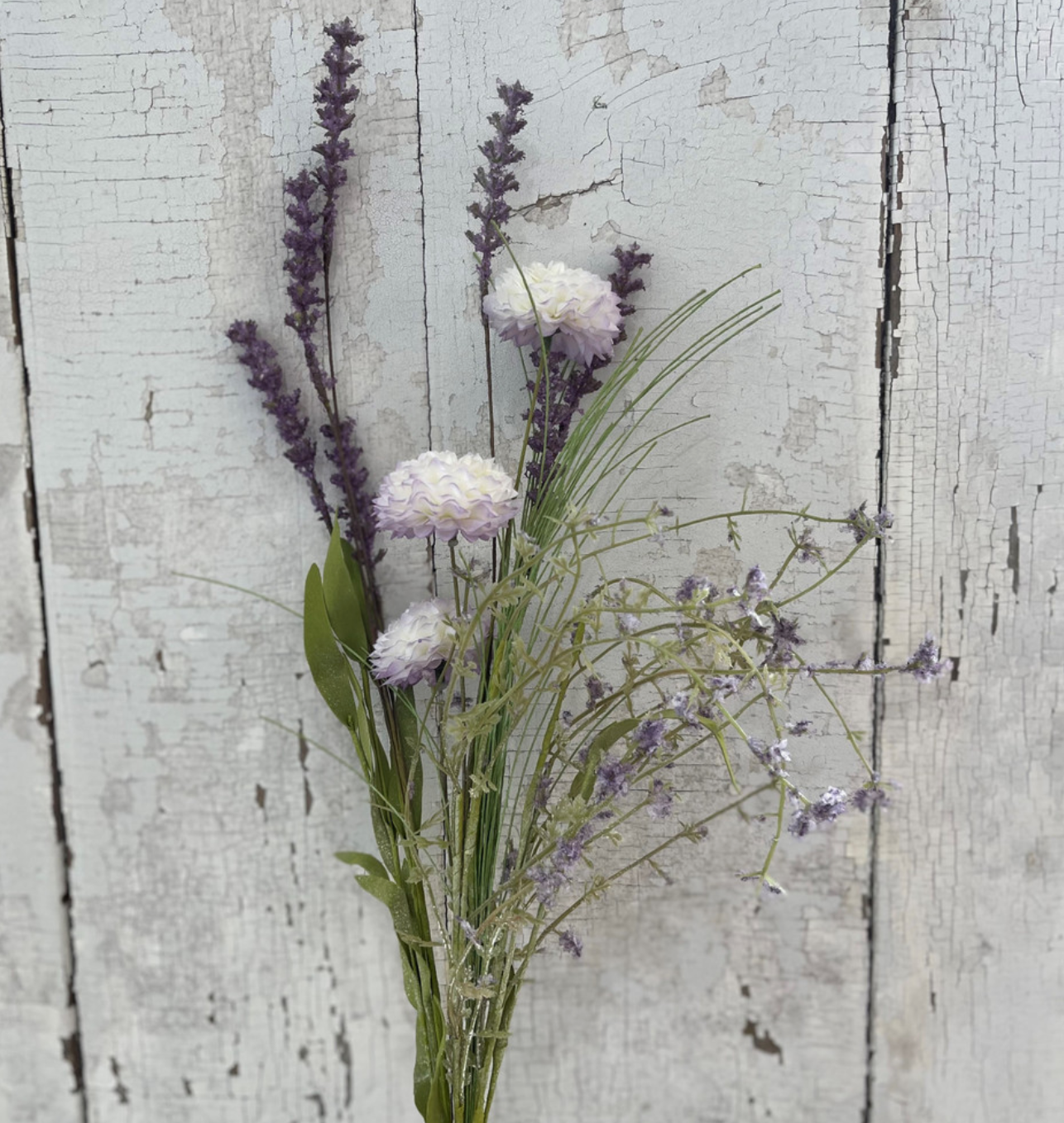24in Dusty Wildflower Spray, this is a green stalk and leaves with dusty purple flowers.