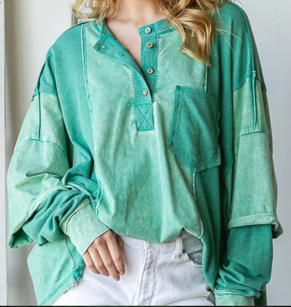 WASHED HENLEY NECK OVERSIZED LONG SLEEVE TOP