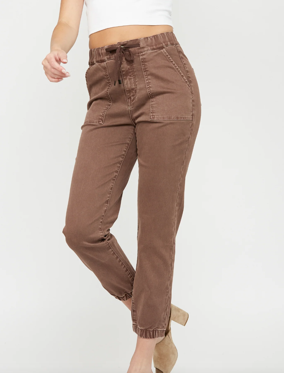 The best jogger hyou will ever find! These have an elastic waist with a button and zip enclosure. They are a crop but on me(I am 5'-4") They are just above the ankle. The ankle has an elastic band that is not tight. Experience next-level comfort with our Jogger Crop! These stylish joggers feature an elastic waist for a perfect fit, complete with a button and zip enclosure. With its cropped length, these joggers are perfect for any height (even for the vertically challenged like me!) and the ankle is finished off with an elastic band that's not too tight. Jog in style without compromising on comfort with our Jogger Crop - the ultimate bottoms for all your activities!