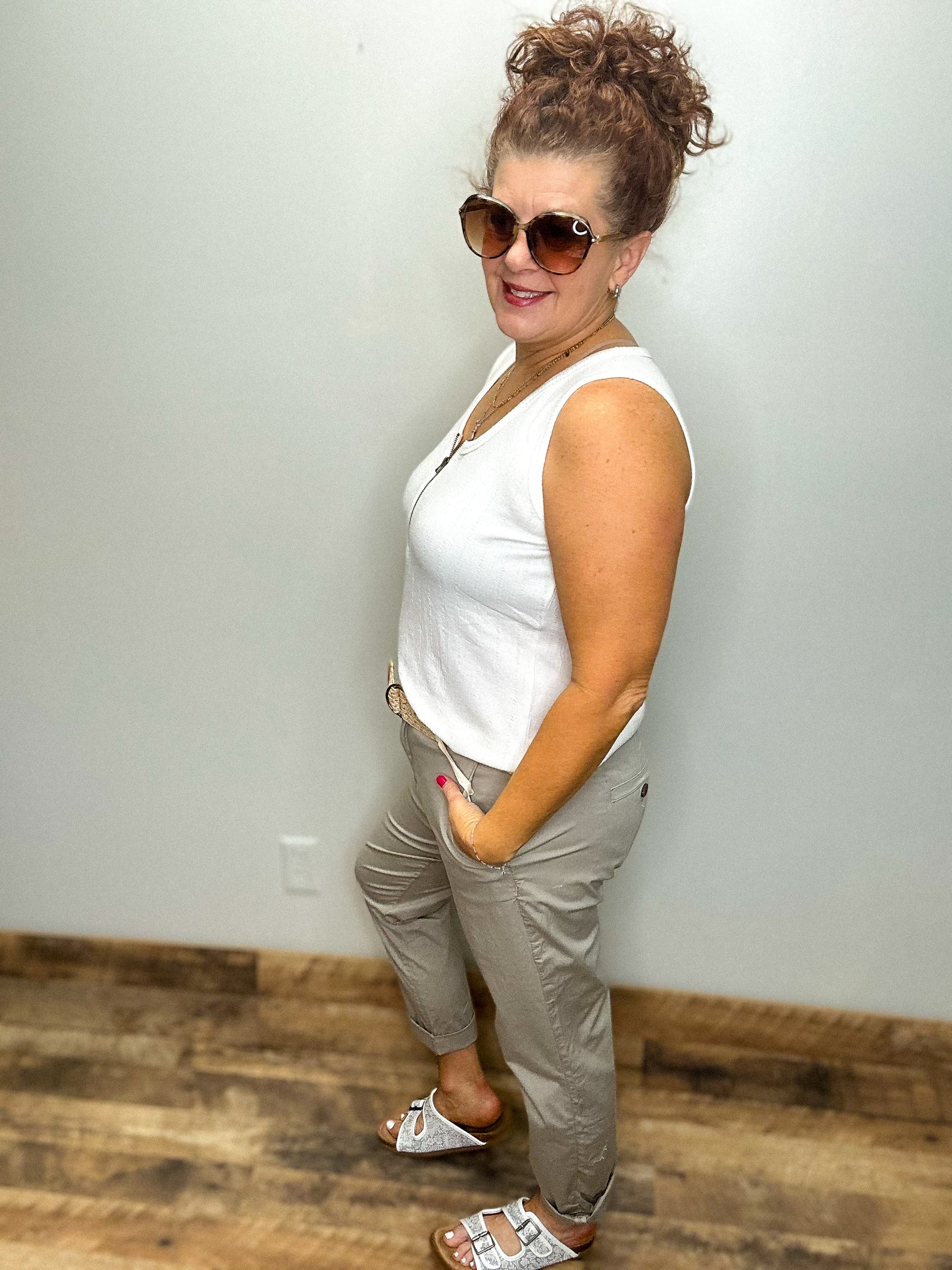 Kathy is wearing a large, Julie liked this in a 2X- the armholes fit perfect but fitted around middle so she liked it layered under another item.