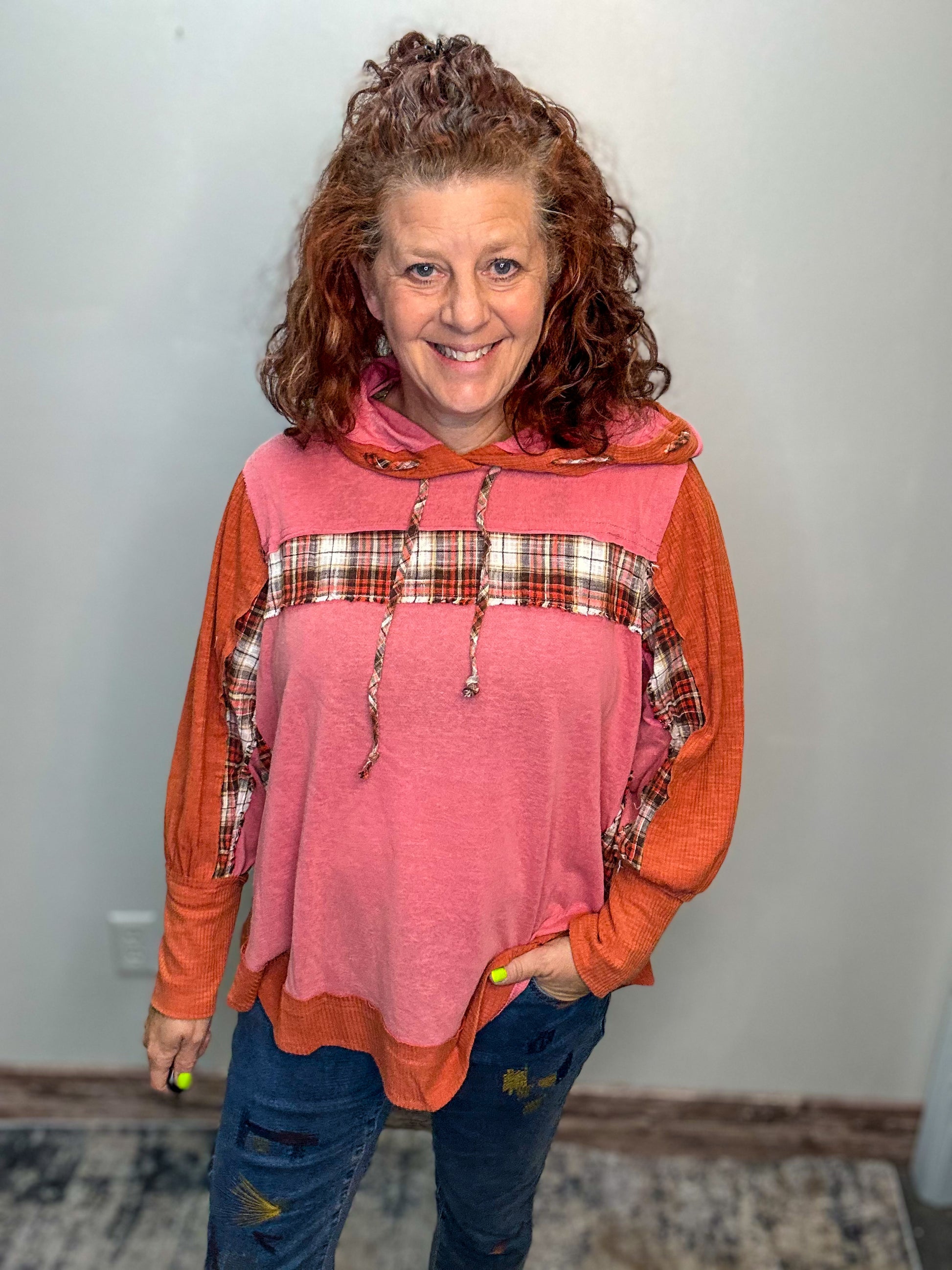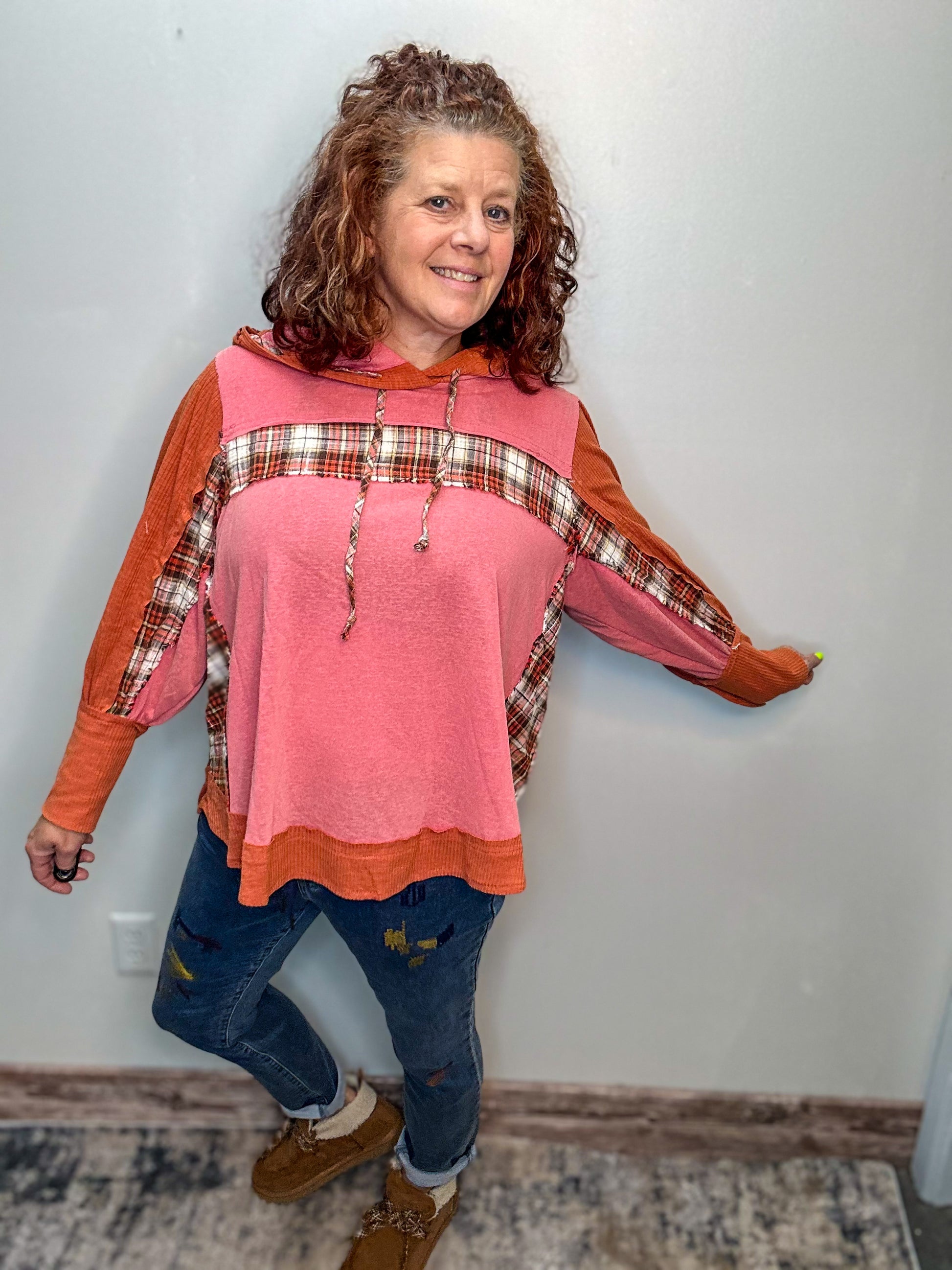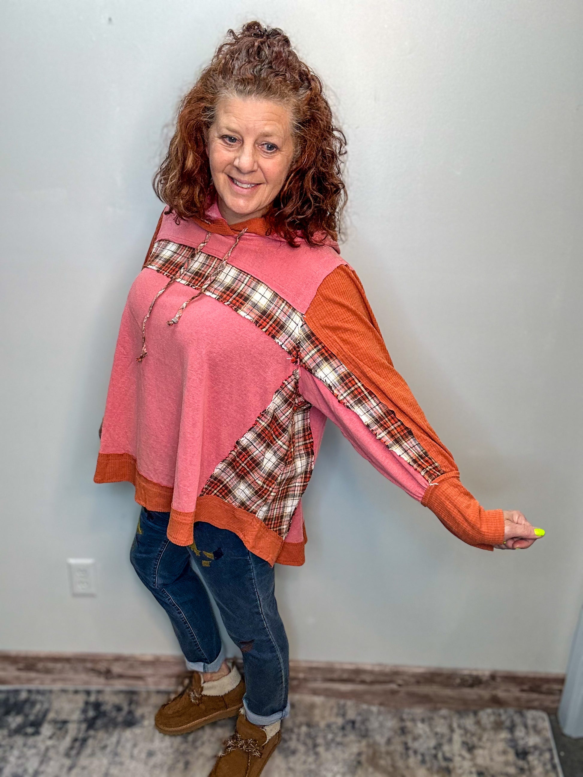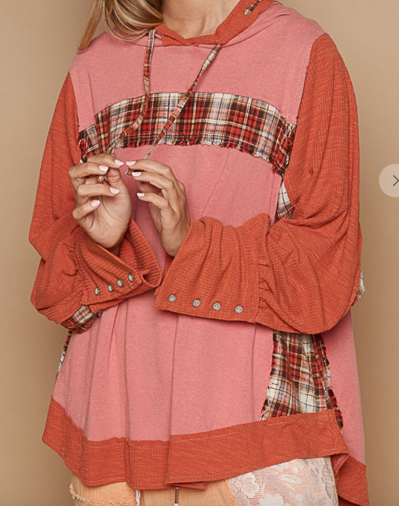 3/4 sleeve Designed in hooded relaxed fit top in cotton with plaid. Specs/Dimensions: - BUST: 25-1/2" - LENGTH (front):26" - LENGTH (back):28" - SLEEVE: 23" - SHOULDER: 13-3/4"