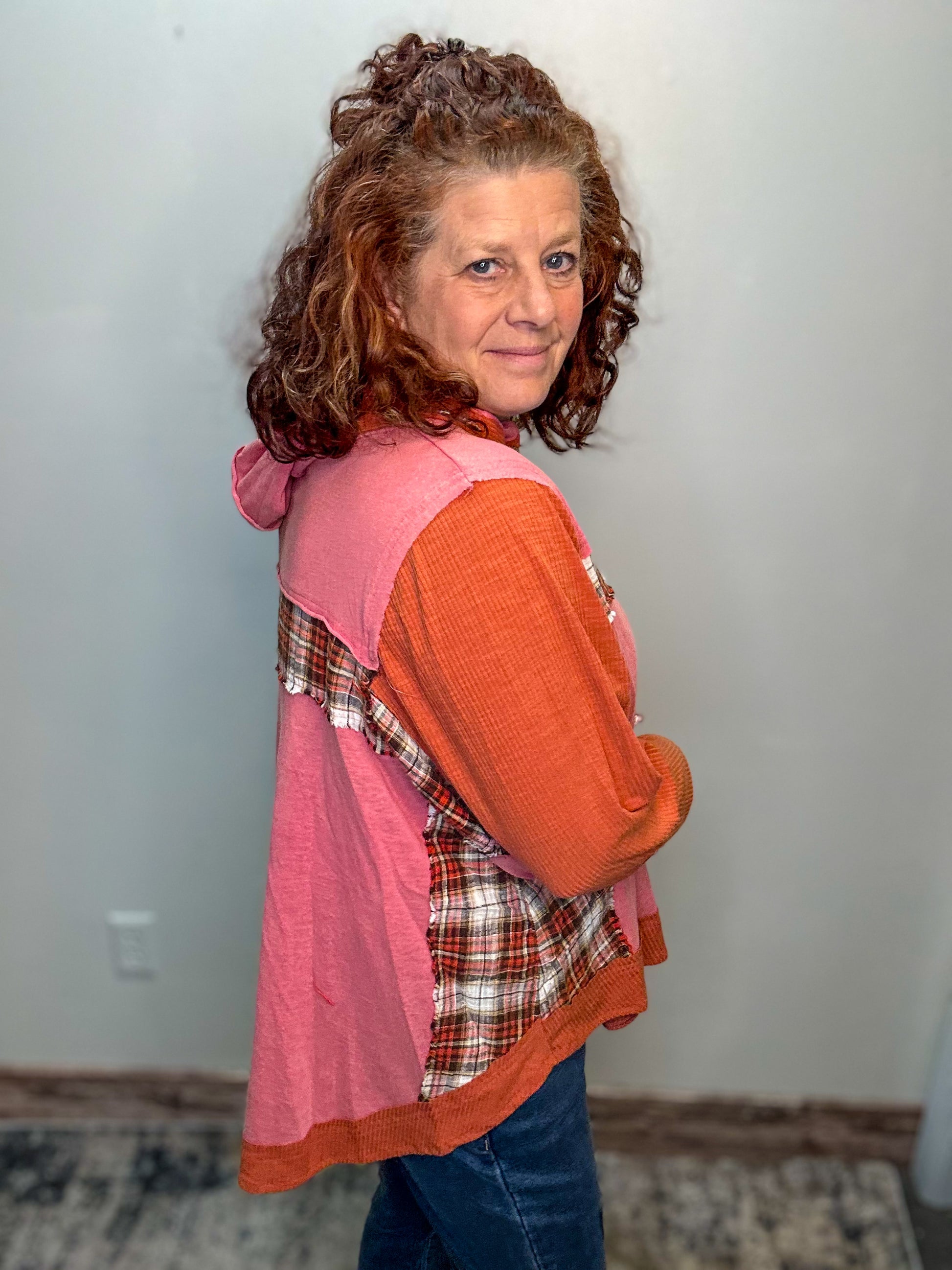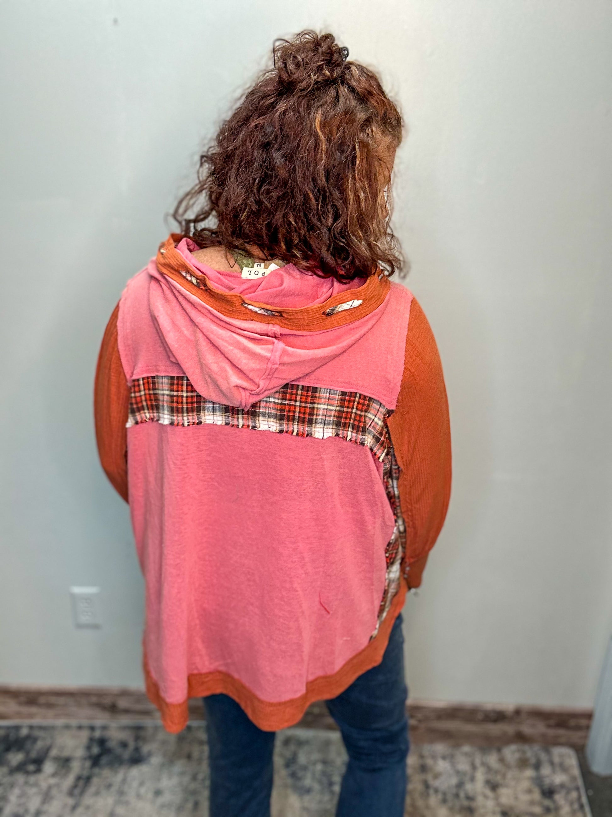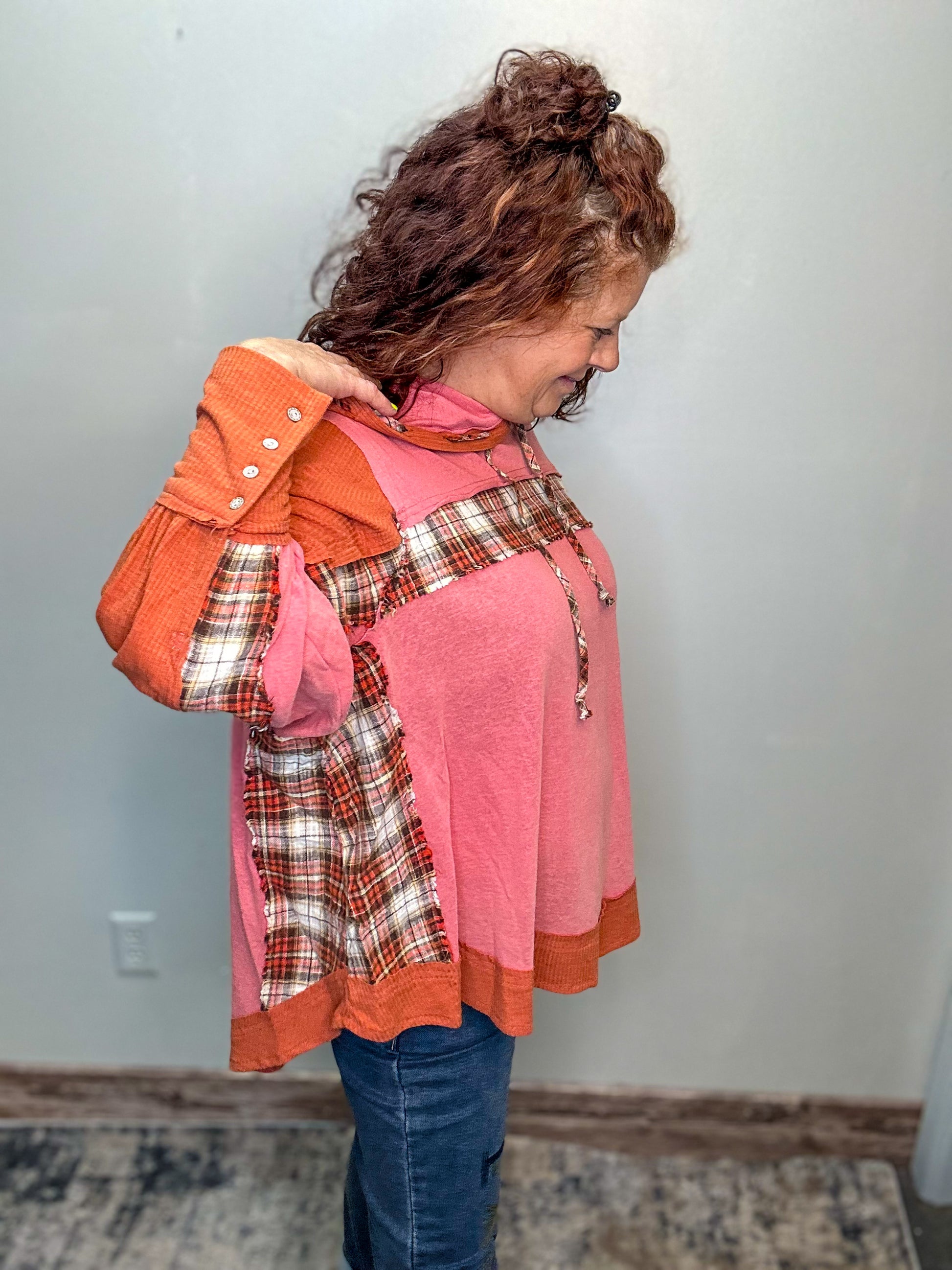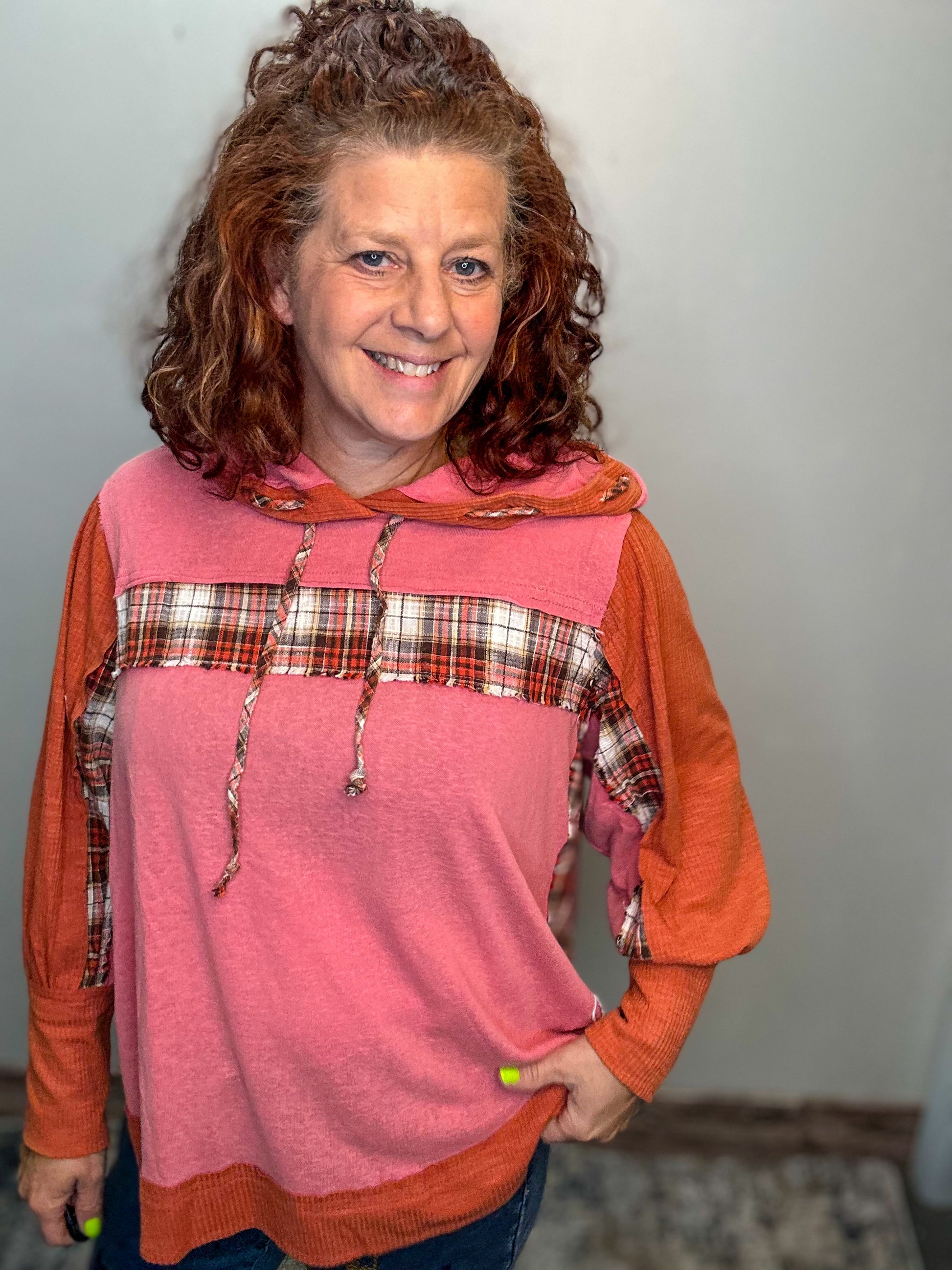 3/4 sleeve Designed in hooded relaxed fit top in cotton with plaid. Specs/Dimensions: - BUST: 25-1/2" - LENGTH (front):26" - LENGTH (back):28" - SLEEVE: 23" - SHOULDER: 13-3/4"
