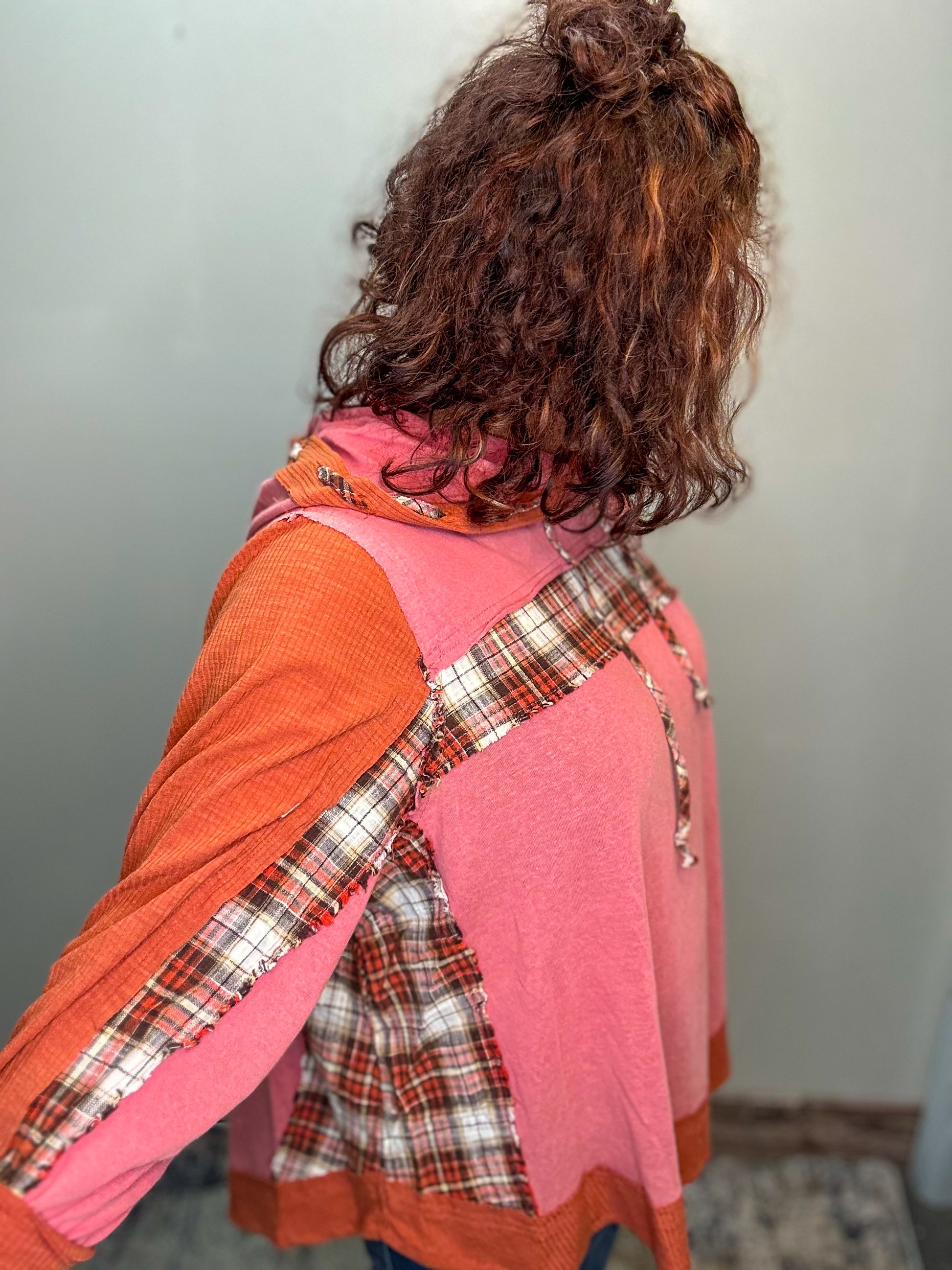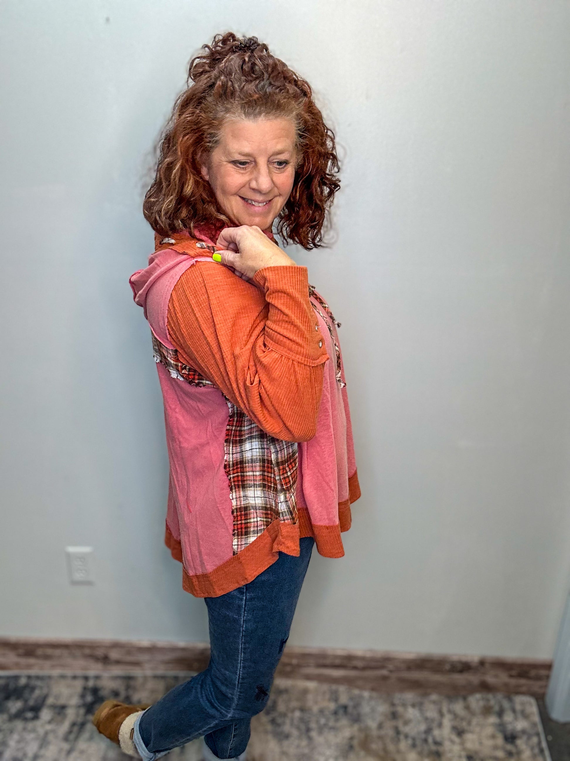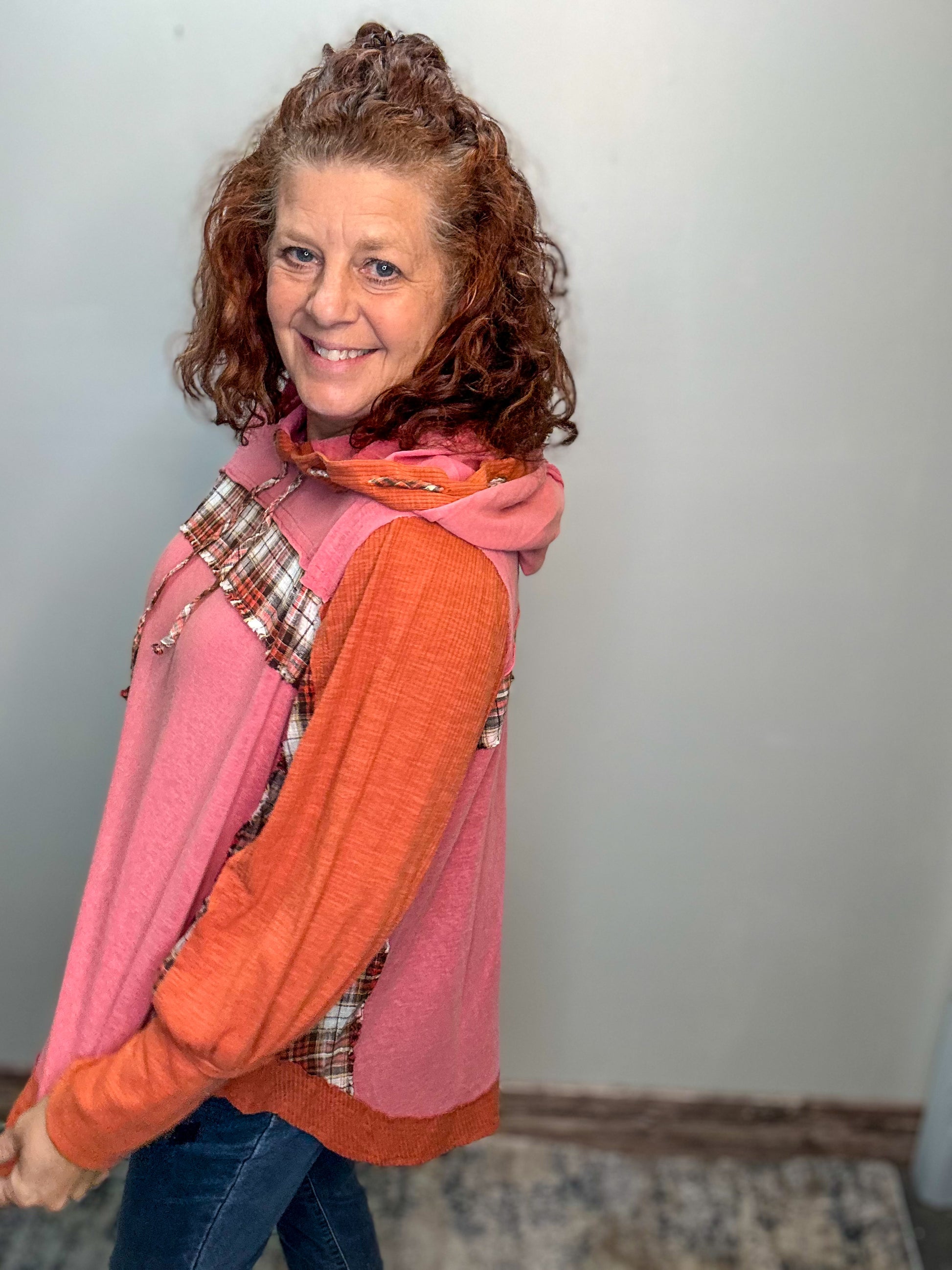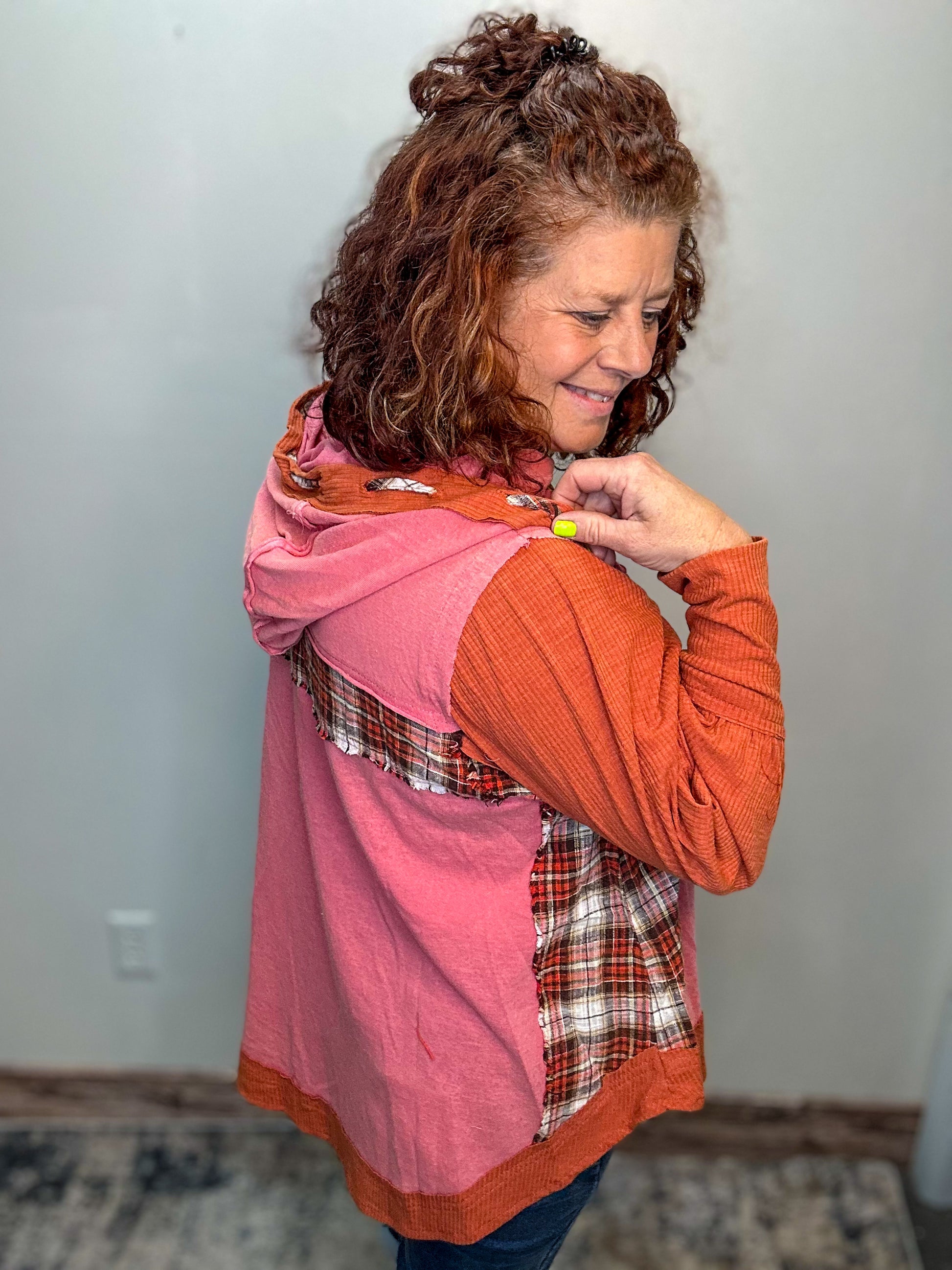 3/4 sleeve Designed in hooded relaxed fit top in cotton with plaid. Specs/Dimensions: - BUST: 25-1/2" - LENGTH (front):26" - LENGTH (back):28" - SLEEVE: 23" - SHOULDER: 13-3/4"
