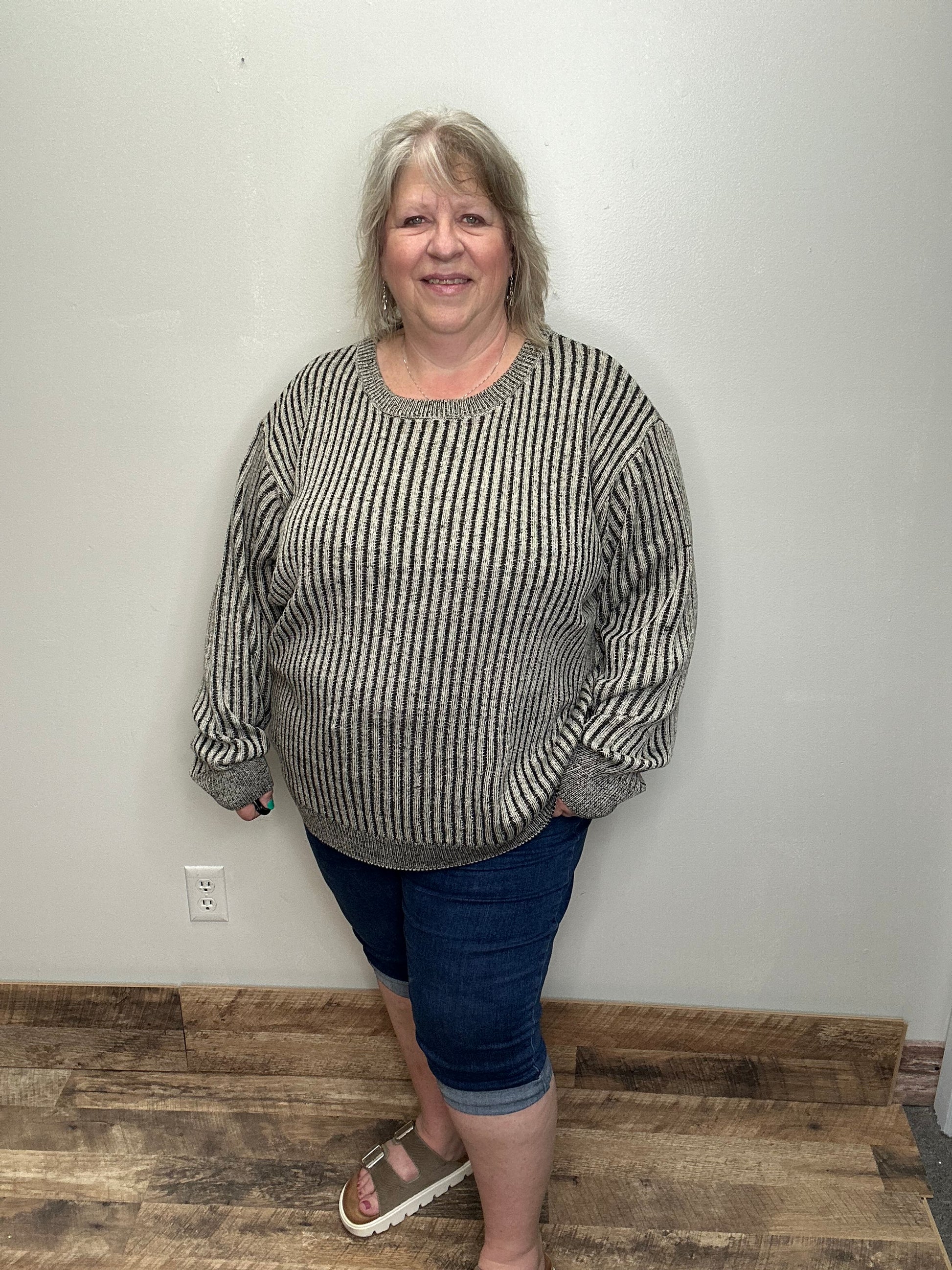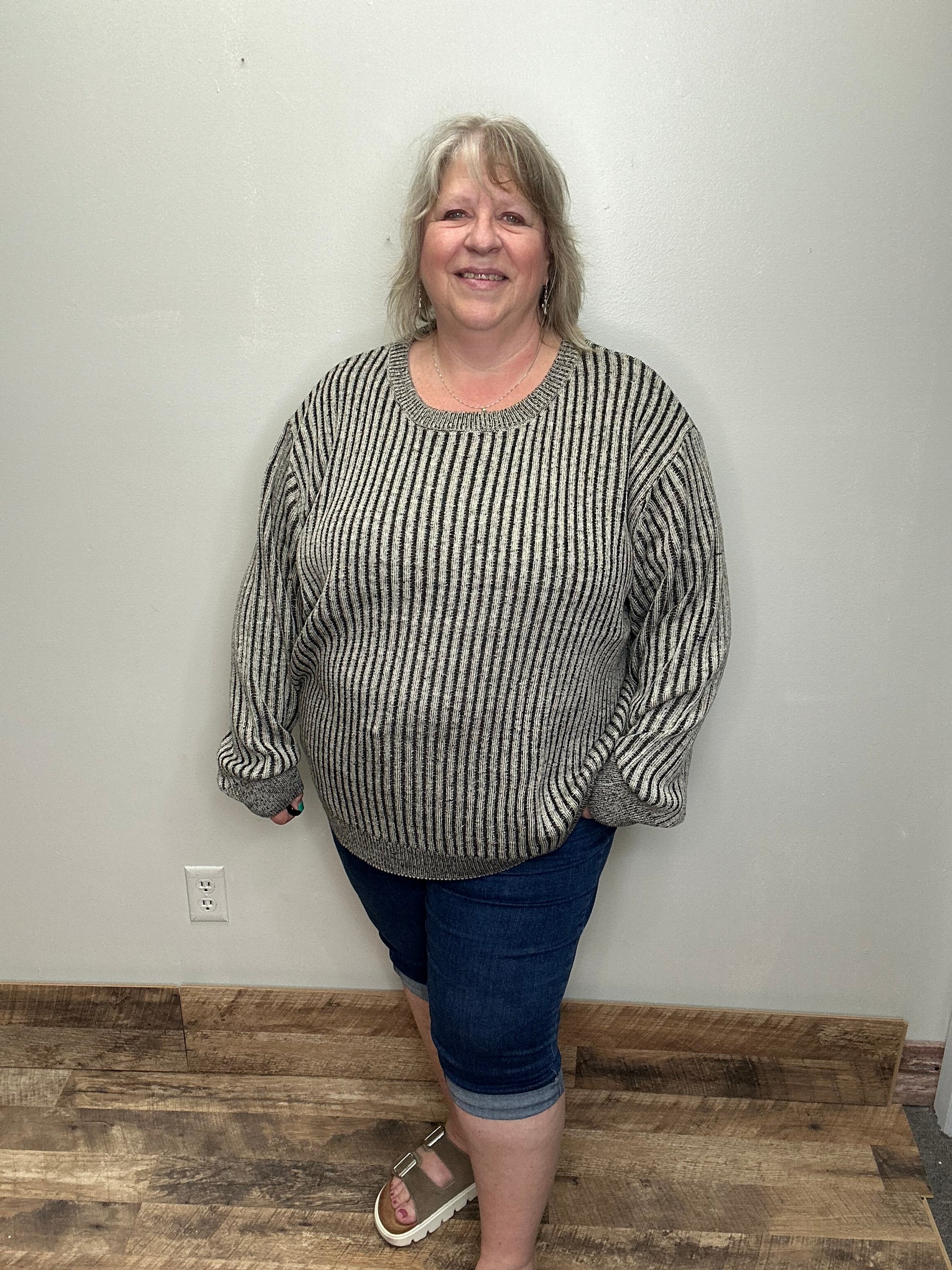Curved hem two tone wide ribbed sweater. this Sweater features a hi-lo curved hem.