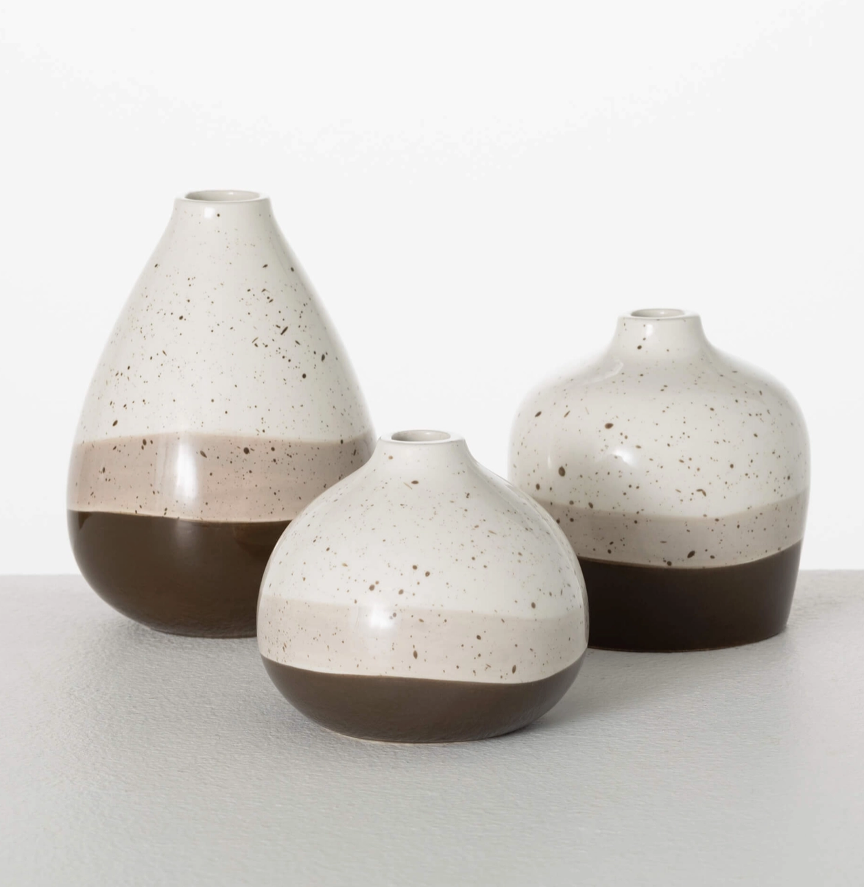 Elevate your home decor with the Strata Mini Bud Vase Trio from Sullivans. These three chic vases feature an exclusive, natural design with no holes, allowing you to display your favorite buds. The set of three vases in varying sizes adds visual interest and depth to any tabletop, mantel, or bookshelf. Whether you use them individually or cluster them together, these exclusive vases bring a touch of natural elegance to any space. -Dimensions: 4.5"L x4.5"W x6", 4.25"L x4.25"W x4.5", 4.25"L x4.25"W x3.75" -Weight: 14.50oz, 12.00oz, 9.75oz -Color: Multicolor -Material: Ceramic -Set Size: 3