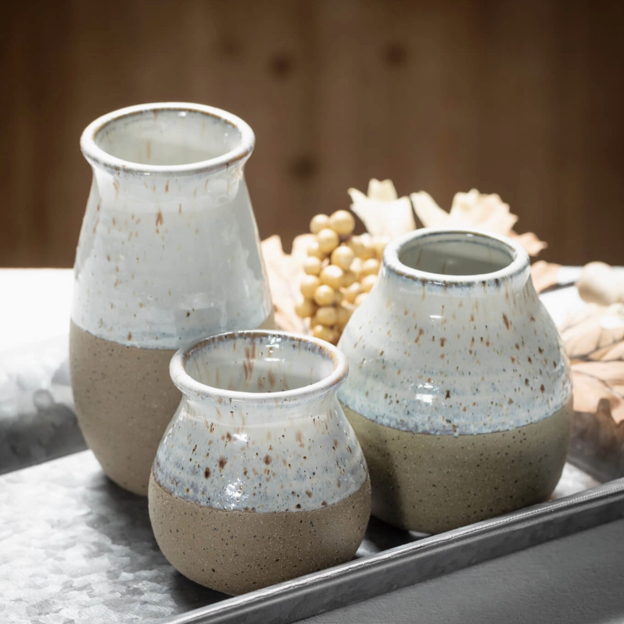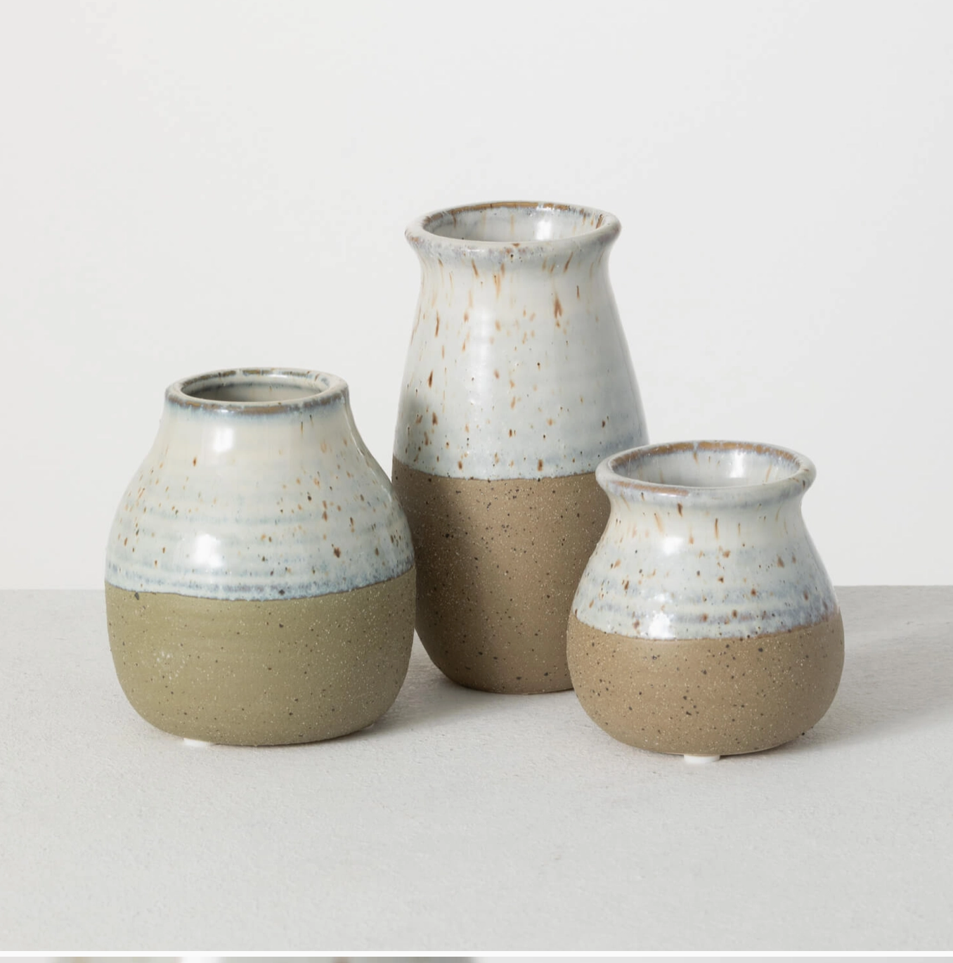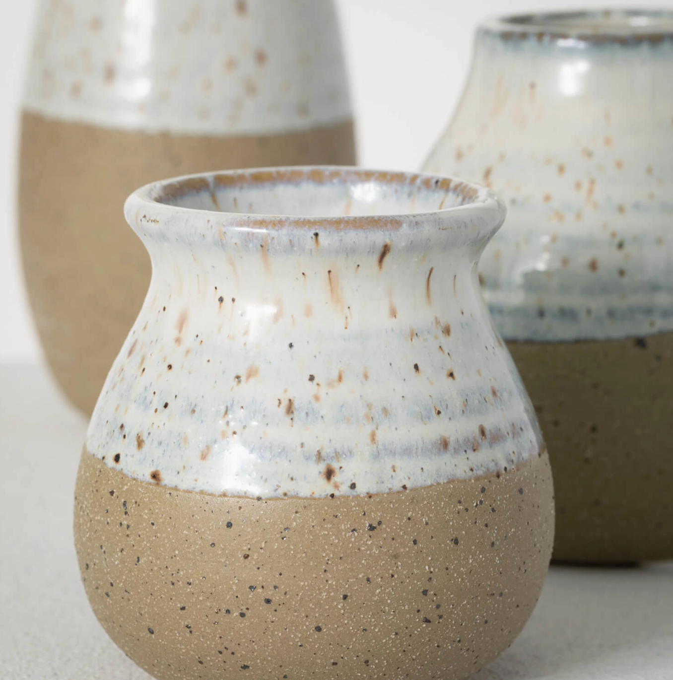 Terracotta, clay, and even concrete have unique properties of being sustainable, safe, durable and versatile enough for every style! The speckled pattern and gloss/matte finish of these containers are both modern and classic. Watertight. -Exclusive: Yes -Dimensions: 3.25"L x3.25"W x5.5", 3.5"L x3.5"W x4", 3.25"L x3.25"W x3.25" -Weight: 1.0lbs 8.00oz, 1.0lbs 4.00oz, 1.0lbs 4.00oz -Color: Multicolor -Material: Ceramic -Set Size: 3