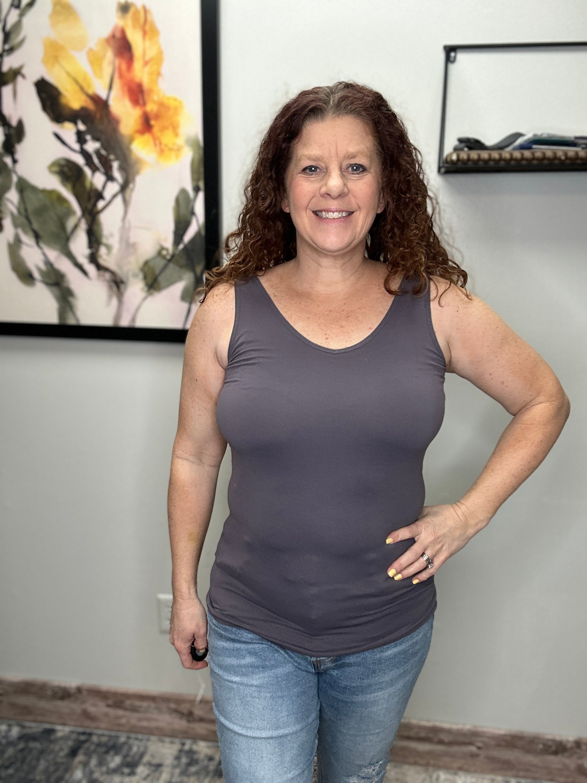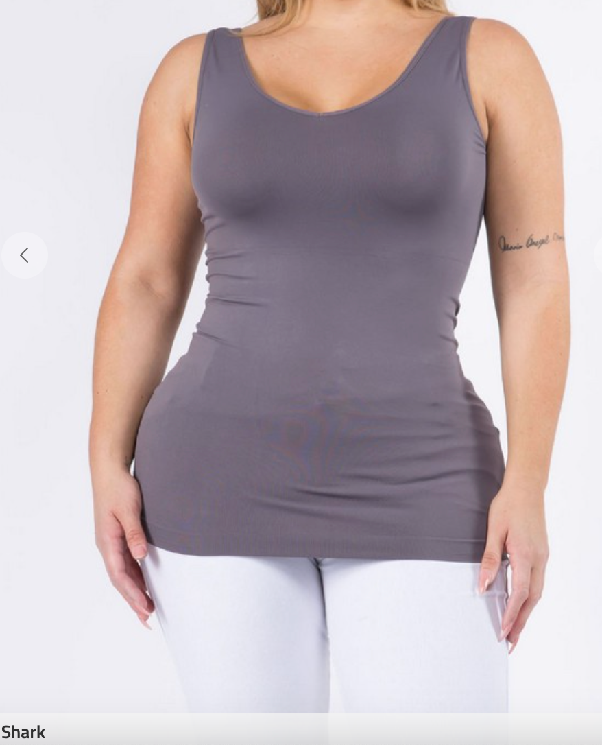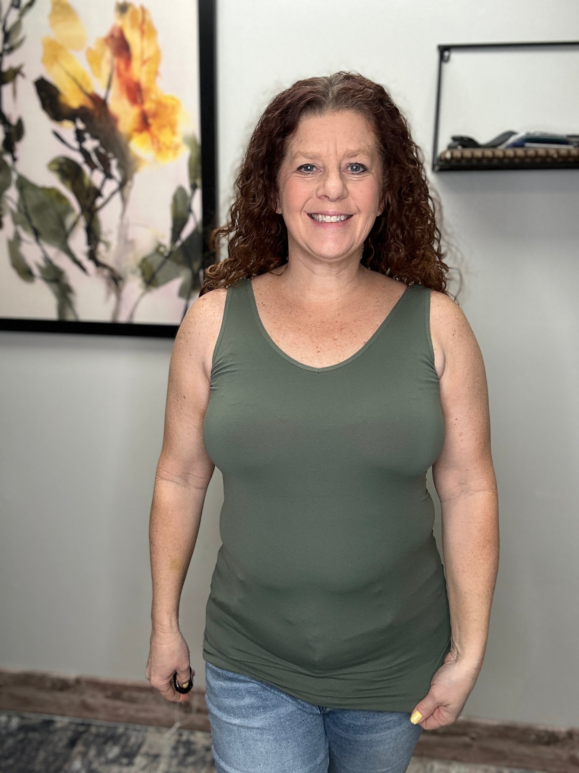 This seamless tank makes styling any outfit a breeze! Featuring a v-neckline and fitted silhouette in a buttery, soft fabric that's very comfortable for wearing all day. - Wide shoulder straps - V-neckline - Back scoop neck - Fitted silhouette - Seamless design - Buttery soft fabrication with stretch - Pull on/off - Longline hem