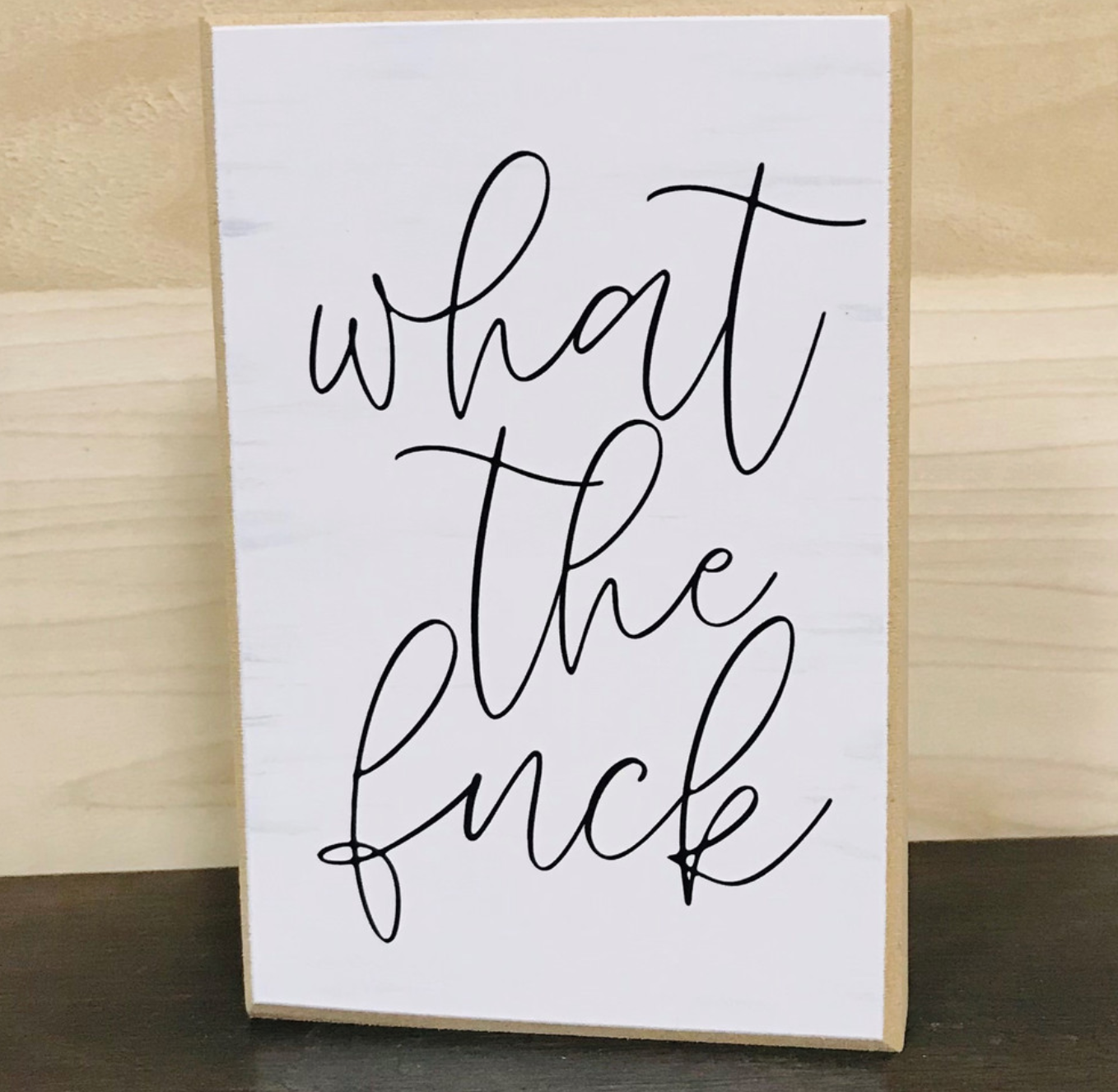 This is a fun block with a lightly textured white background that simply says "what the fuck" in a scripted cursive font. The 6X4X1 size makes it perfect to display on table-top, shelf or mantle.