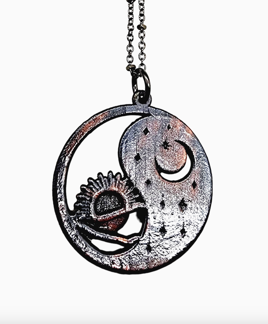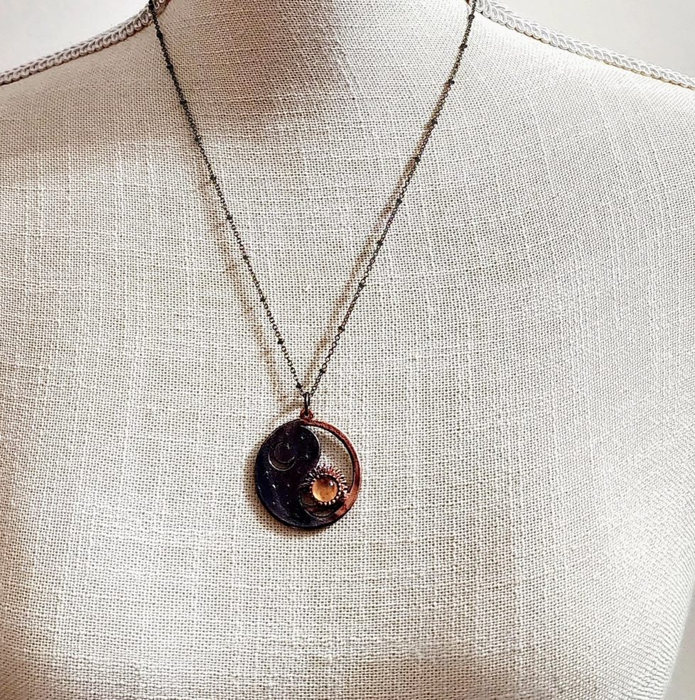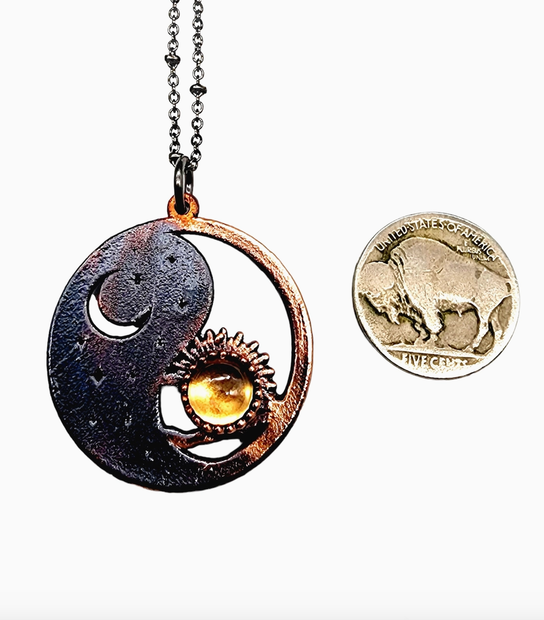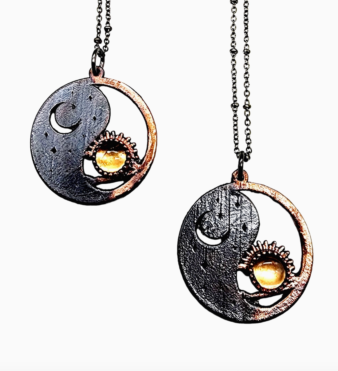 One copper electroformed Yin Yang Lemon Quartz on an 18” gunmetal chain. Who is the Yin to your Yang, sun to your moon, dark to your light? These pendants are a representation of 2 halves that together completing unity. The word Yin comes out to mean “shady side” and Yang “sunny side”. These pendants feature the moon along with a Lemon Quartz crystal sun. Lemon Quartz is said to help structure, focus and amplify thoughts. Because the color yellow is associated with clarity, communication and happiness, Lemon Quartz is believed to help balance and strengthen these aspects. Pendants measure approximately 35mm. Size, shape, and color may vary as no two pendants are exactly alike.